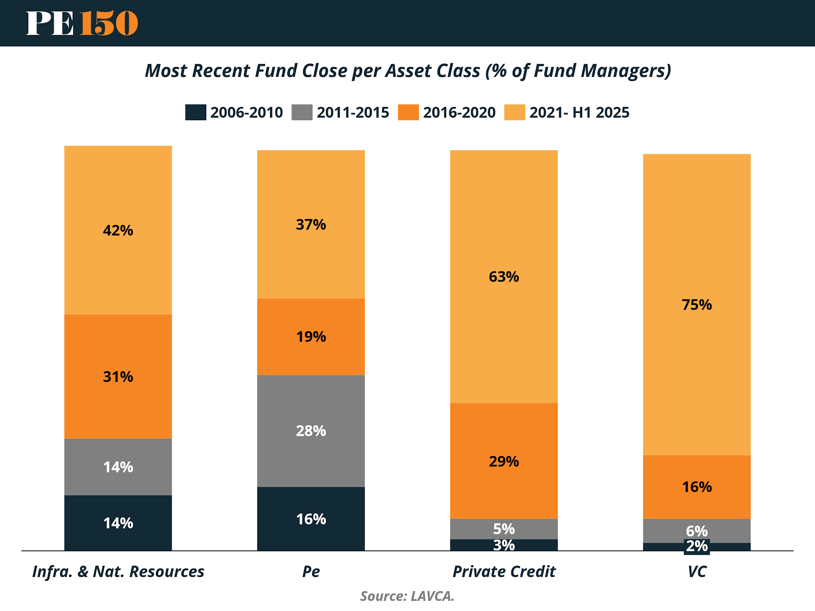 If prior sections highlighted diversification and capital concentration, the timing of most recent fund closes adds another important dimension: which asset classes are driving the current fundraising cycle.