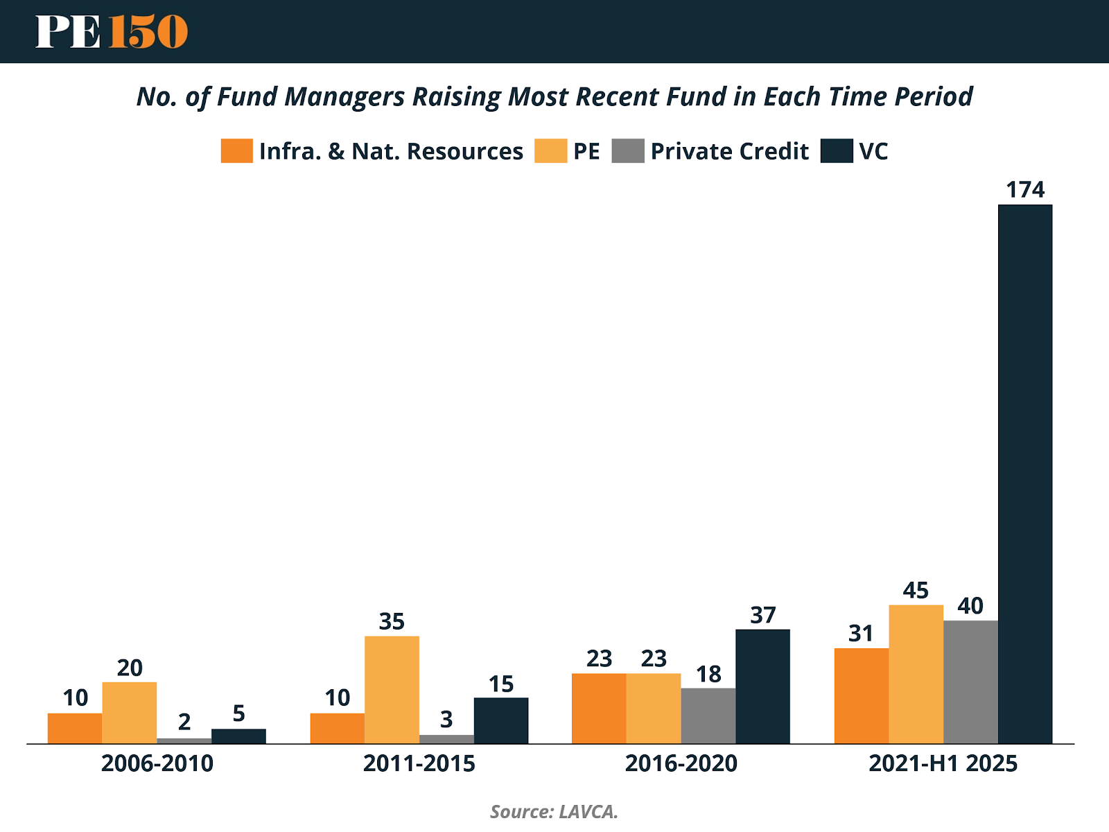 The most striking development comes in 2021–1H 2025. Infrastructure managers increased to 31, PE managers to 45, and Private Credit to 40. However, the standout figure is Venture Capital, with 174 managers raising funds during the period — an exponential expansion compared to prior cycles.