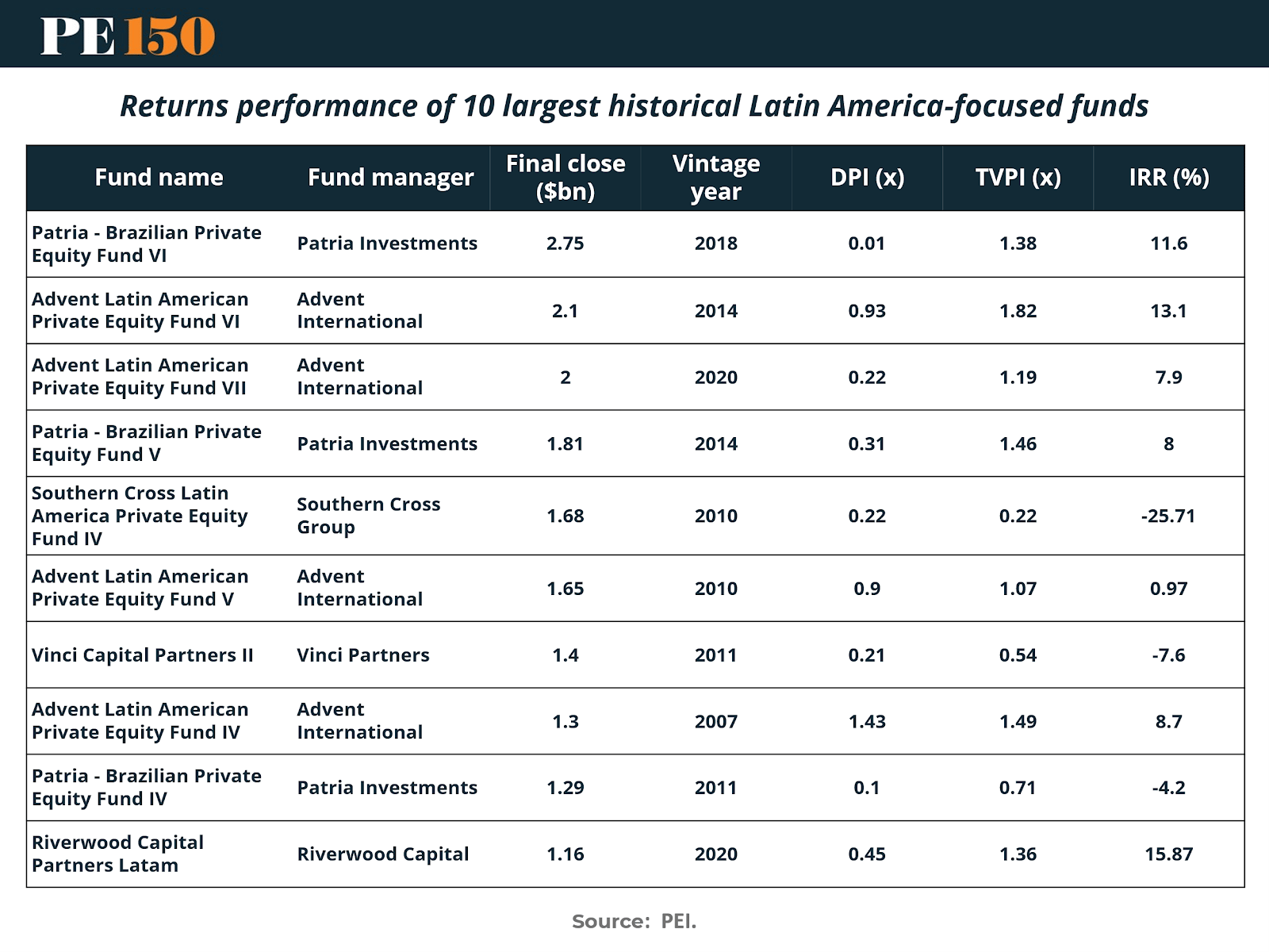 The ten largest Latin America-focused private equity funds for which performance data is available illustrate substantial dispersion in realized and unrealized returns. IRRs range from deeply negative outcomes to mid-teens performance, while total value multiples (TVPI) span from significant capital impairment to strong value creation. DPI ratios remain low for more recent vintages, reflecting the early stage of realization rather than necessarily weak underlying performance.