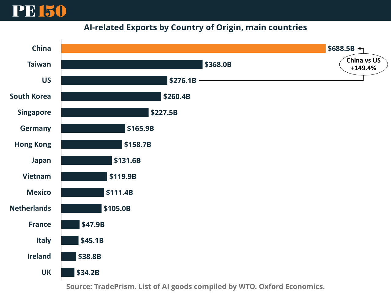 AI trade has quietly become a macro shock absorber. AI related goods now account for roughly 11% of global exports, and the geography matters more than the headline growth. China exports nearly $690B of AI related hardware, more than 2.5x the United States at $276B, with Taiwan and South Korea filling out the semiconductor spine of global trade.
