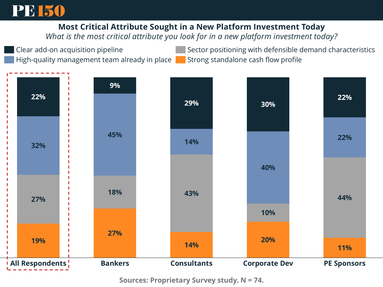 Finally, strong standalone cash flow profiles (19%) ranked lowest overall, a somewhat counterintuitive result given today’s financing environment. However, this does not suggest cash flow is unimportant—rather, it may indicate that baseline cash generation is increasingly viewed as table stakes, while differentiation comes from people, strategy, and sector selection.